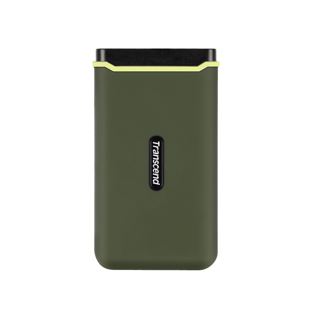 Transcend ESD380C được bọc trong lớp cao su silicone màu xanh quân đội, có khả năng hấp thụ lực tác động.
