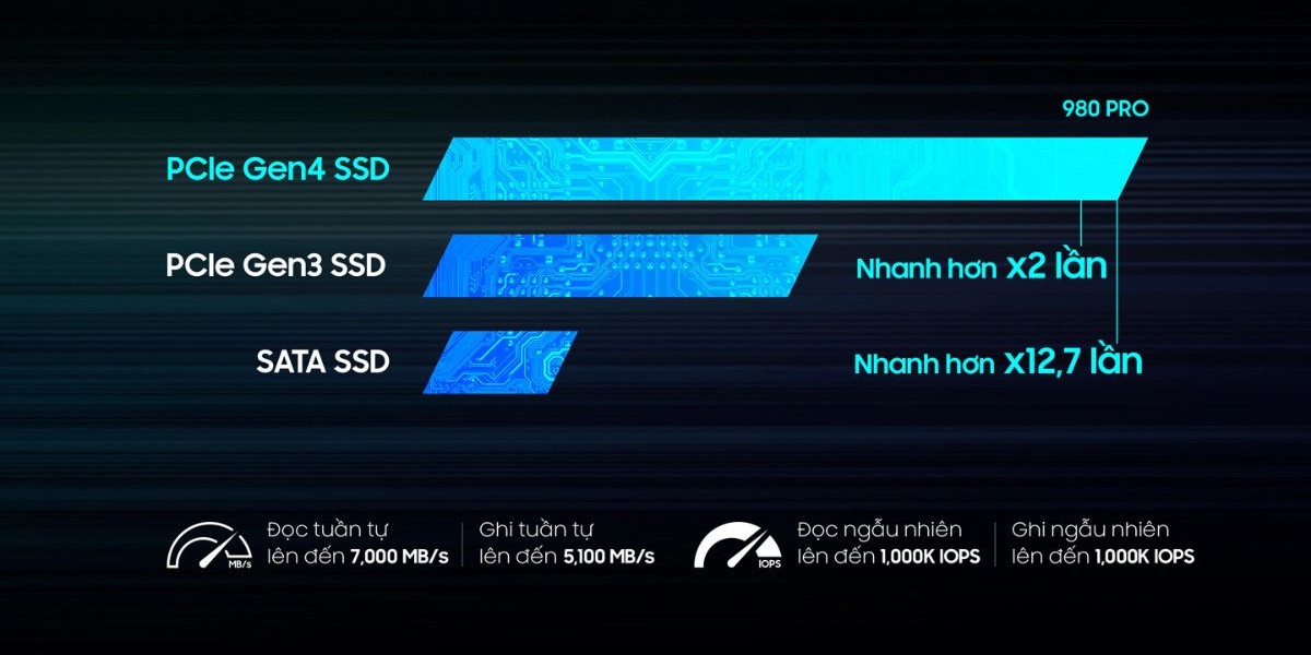Với công nghệ PCIe 4.0 tiên tiến, SSD 980 PRO mang đến tốc độ đọc ghi dữ liệu lên đến 7000 MB/s, nhanh gấp đôi so với thế hệ SSD PCIe 3.0 và nhanh hơn đến 12,7 lần so với SSD SATA truyền thống. Điều này có nghĩa là bạn có thể khởi động máy tính, mở ứng dụng và truyền tải dữ liệu nhanh chóng hơn bao giờ hết, tiết kiệm thời gian quý báu của bạn.